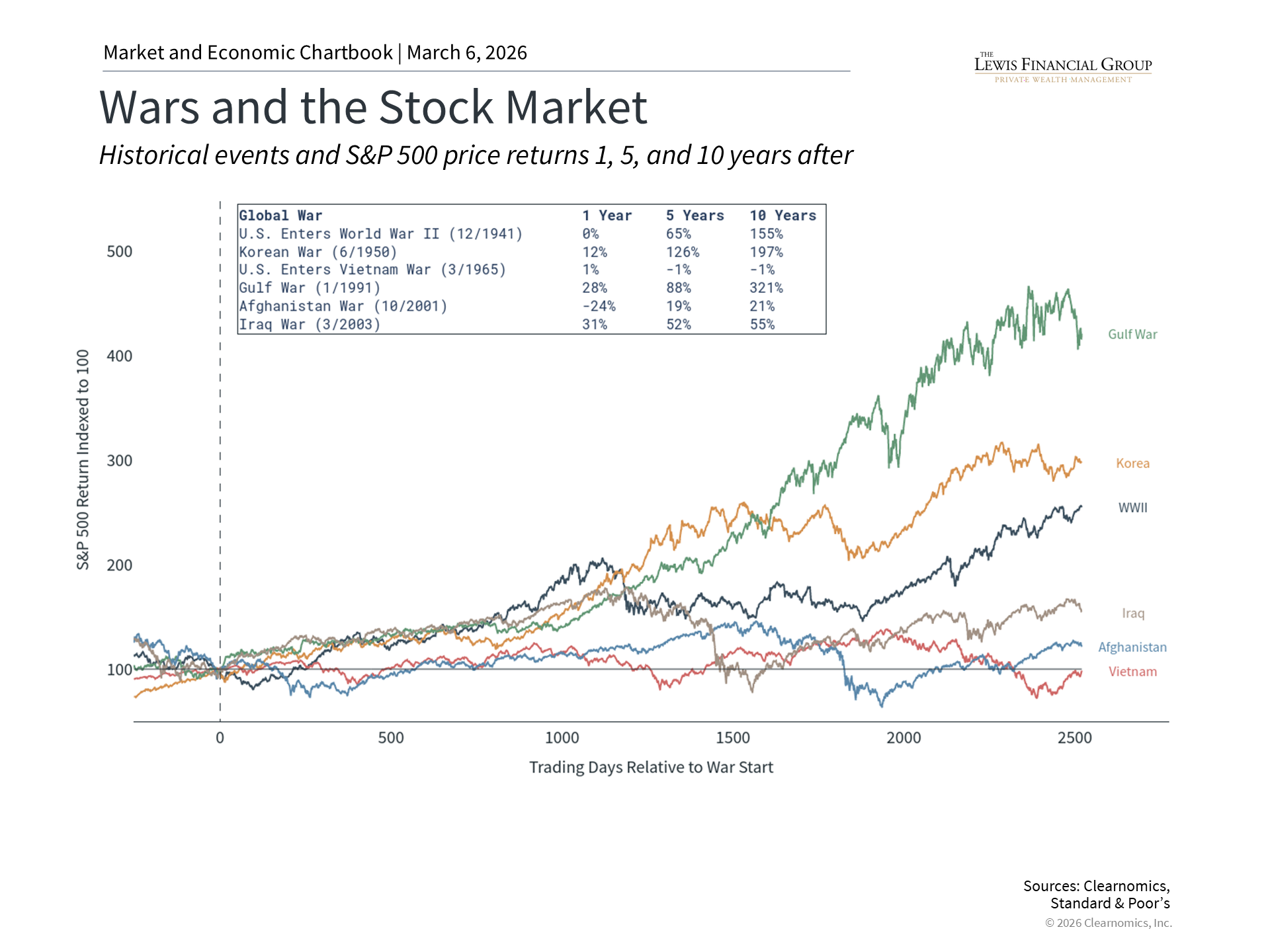 For long-term investors, the most important lesson from past geopolitical conflicts is the value of staying invested. It's natural to feel uneasy when headlines describe military strikes, retaliatory attacks, and the possibility of a wider regional war. These events involve real human consequences and are unlike the typical flow of market news about earnings, valuations, and economic data. The accompanying chart makes clear that markets have navigated even the most serious global events. From World War II to the Gulf War to the wars in Iraq and Afghanistan, markets experienced short-term volatility but were driven by economic fundamentals over the long run. More recently, the conflicts between Russia and Ukraine, and between Israel and Hamas, created uncertainty but did not derail the broader market trajectory. It's also important to note that Iran plays a minimal direct role in investment portfolios. Iran has been under heavy sanctions for years and its economy has been experiencing hyperinflation, with its currency, the Rial, collapsing. So, very few investors have direct exposure to the country in their asset allocations. Markets may experience volatility in the coming days and weeks as the situation unfolds. Oil prices could rise further, and uncertainty could weigh on investor sentiment. But trying to time these moves has historically been counterproductive. Historically, markets have shown that they can rebound unexpectedly, and missing even a few of the best trading days can significantly reduce long-term returns. The bottom line? The U.S. and Israeli strikes on Iran represent an important geopolitical development. However, history shows that investors who maintain diversified portfolios aligned with their long-term financial goals are best positioned to navigate periods of uncertainty. | |||