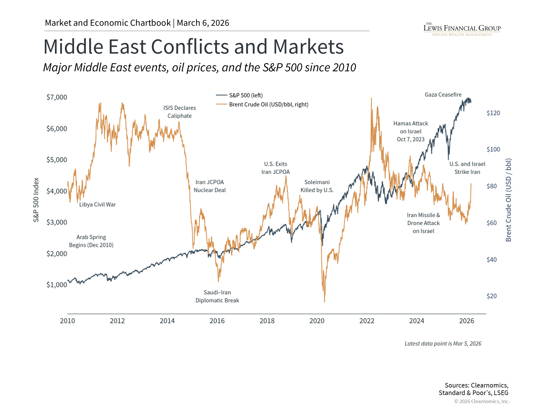 As you have seen in the news, the U.S. and Israel have launched military strikes against Iran, targeting its leadership, military assets, and nuclear infrastructure. Iran's Supreme Leader is confirmed to have been killed, and Iran has retaliated with missile and drone attacks across the Middle East. President Trump has stated that the goal of the operation, dubbed "Operation Epic Fury," is regime change in Tehran, with strikes expected to continue for weeks and a number of U.S. troop casualties already reported. The situation is evolving rapidly, and the safety of civilians in the region and our troops are the most important consideration. Without taking away from the severity of these events, investors will naturally have questions about what this means for markets, oil prices, and their portfolios. President Dwight D. Eisenhower once said that "plans are worthless, but planning is everything." Applied to today, the lesson is that specific geopolitical events are unpredictable, but the fact that they occur regularly is not. The process of structuring a portfolio and making financial plans is designed precisely to deal with this uncertainty. While each event is unique, financial markets have navigated countless wars, crises, and regional conflicts, including the U.S. operation in Venezuela earlier this year. The key for long-term investors is to separate geopolitical headlines from portfolio decisions. What should investors keep in mind as events unfold in the coming weeks? These strikes are the latest chapter in an ongoing story